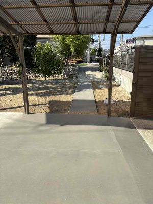 駐車場入り口あたりが道路よりも低くなっているためお家の隣に流れる川が大雨のときに氾濫して道路から水が入ってくるのだそうです。そのため自転車などを停めるこのスペースに水がまわらないようにするためコンクリートを増し打ちしてほしいとのことでした。ただできれば会所を設けてそこで雨水を受けるのがいいのですがなにぶん大雨だとそもそもの雨の排水もいっぱいいっぱいのようでまさに苦肉の策でしょうか。またこのコンクリートからの通路をコンクリートの刷毛引きで作成しました。そんなに雨水が入ってくるということなのでしょうか??