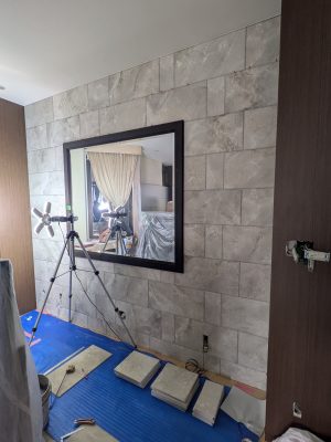 タイルを貼った壁になにかを(この場合はミラーがあります)設置することで自然とその部分を魅せることにつながります。壁のタイルはあくまでも主張しすぎないようになっています。https://www.murakamikenzai.com/contact