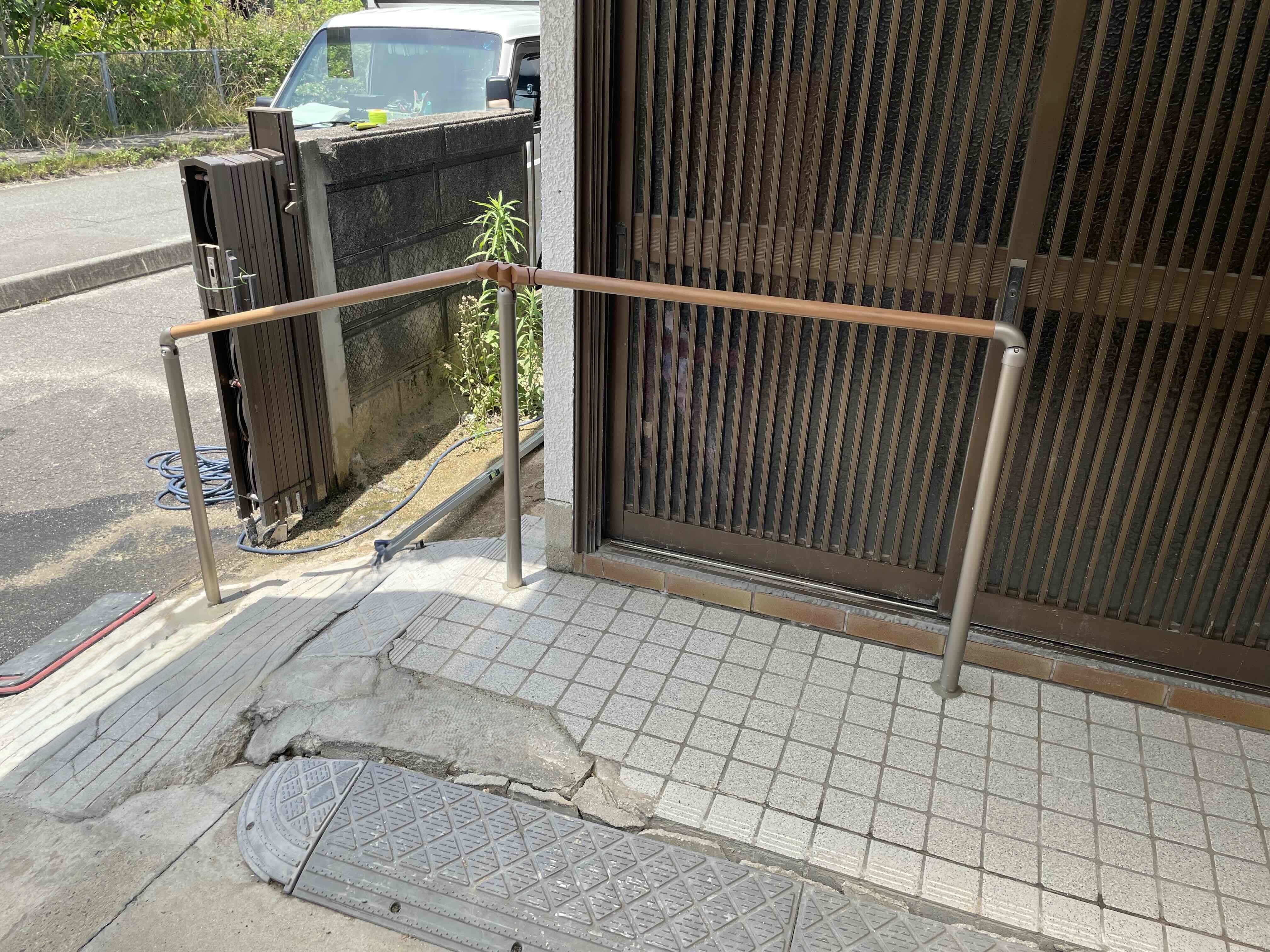 交通事故にあわれたため通常の歩行までも困難になられている状態でした。ただ支えがあれば歩ける様子でしたので介護保険をつかって手摺を設置しました。道路側のスロープはご自分で工事されてたのですがかなりガタガタでしたのでスロープ作成も申請したいところなのですが 現状でスロープが仮にもあるのでそれを壊してやりかえるのは申請が認められませんでした。ただ手摺のおかげでかなり楽になられたそうです。https://www.murakamikenzai.com/contact