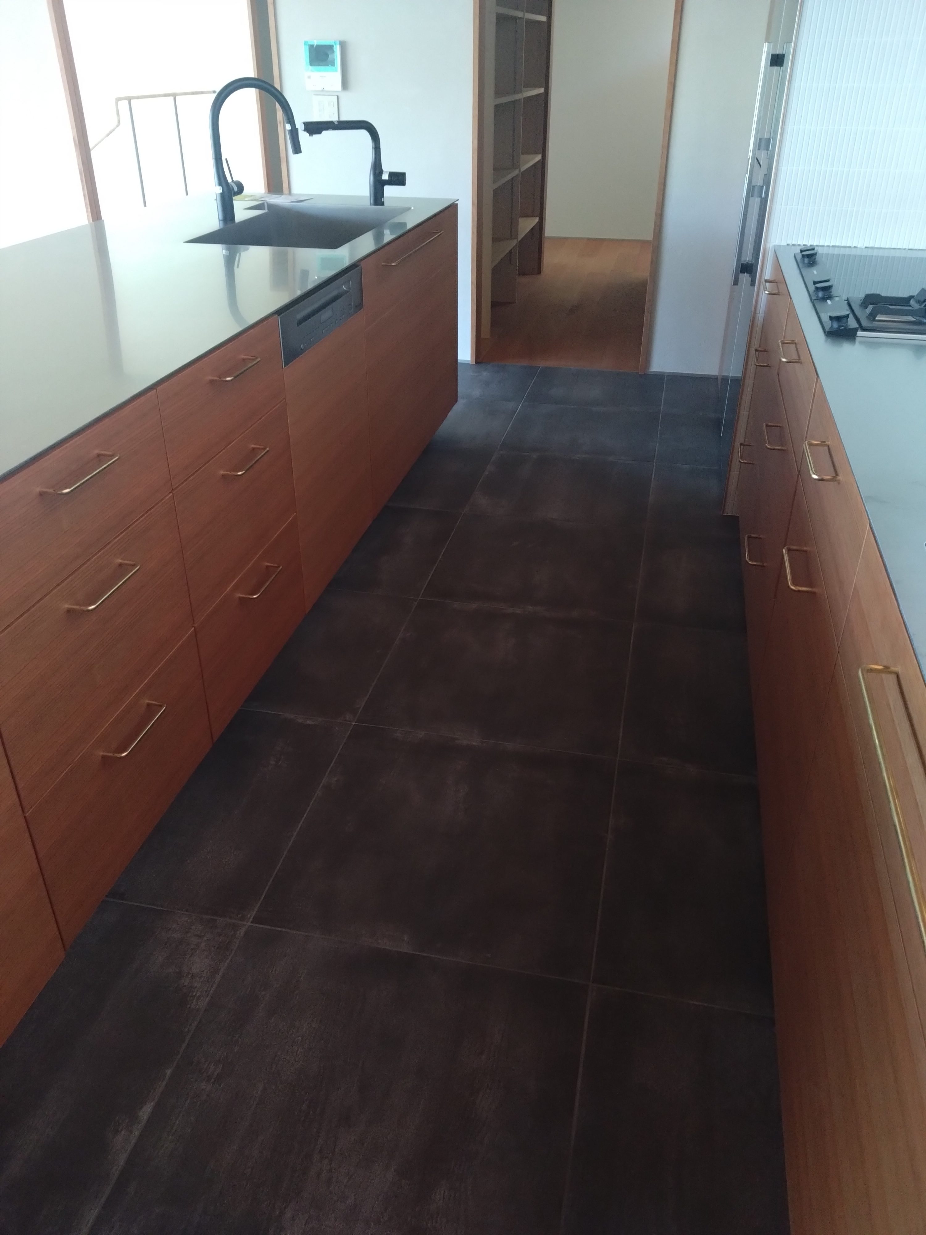 キッチン床部分にはニッタイ工業のフェアフェースを貼りました。これはコンクリート調のタイルで60cm×30cmのとても大判のタイルです。ものによってはコンクリートにでてくる小さなひび割れも模様として組み込まれているのです!https://www.catalabo.org/iportal/cv.do?c=80660040000&pg=257&v=CATALABO&d=link