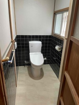 何年か前にせっかく和風便器から洋風便器へのリフォームをされたのですがそのときに小便器を残したままだったので今回 撤去すると同時に間仕切り壁の撤去や床のタイルをクッションフロアに変更されました。壁も砂壁で年数がたっているため砂がぽろぽろ落ちてきておりビニルクロスへとリフォーム。また床をクッションフロアにされることでお掃除がしやすい床へと変わりました。全体的に明るくなった印象です。https://www.murakamikenzai.com/contact