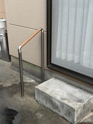お部屋の掃出しから既存の踏み段を使って昇り降りするのに手すりがあったほうがいいのでこれまではレンタル品として手すりを設置していました。ただ場所が浄化槽の部分であったため汲み取りのときにはいちいち移動させて汲み取りしてもらったりしていたそうです。それと寸法も定尺のものなのでこの踏み段を昇り降りするたび手摺を大きく迂回しなければならず服にひっかかるなど意外と危険でした。また毎月費用がかかるのも負担となっていました。そこで介護保険の住宅改修を利用して手すりを施工しました。また手すりも大きく出っ張らずひっかかることもなくなりました。https://www.murakamikenzai.com/contact